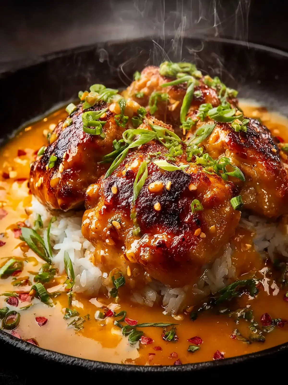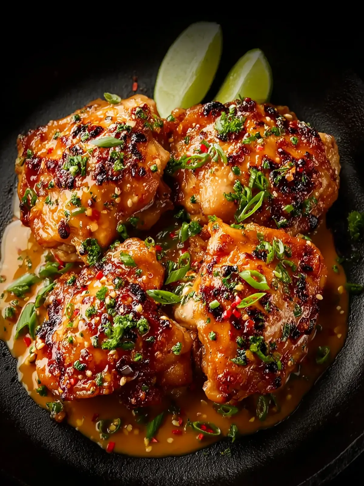 - Return chicken thighs to the skillet, coating each piece thoroughly with the sauce. Garnish with chopped green onions and serve immediately.