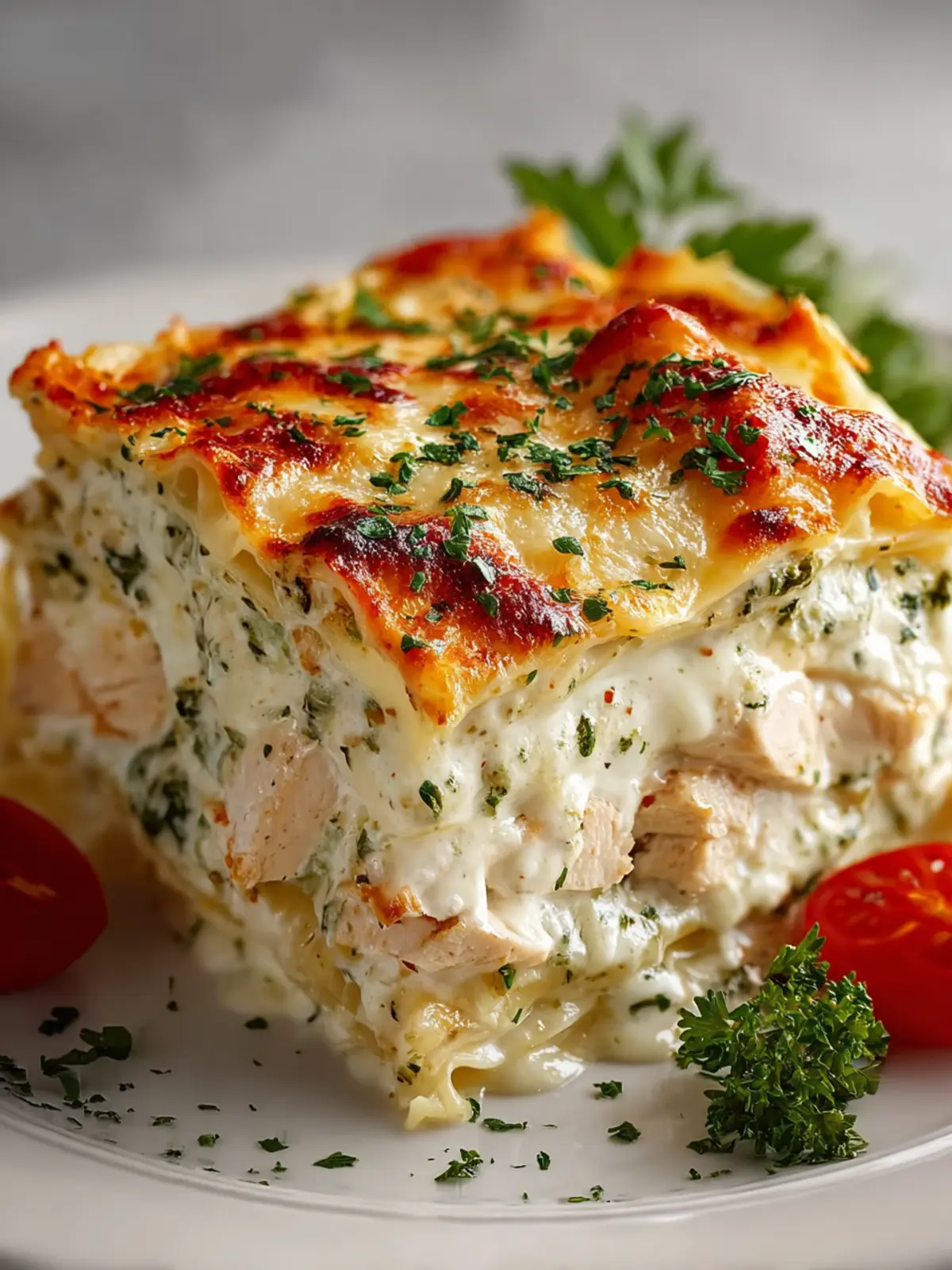 A delicious and creamy chicken Alfredo lasagna with layers of pasta, ricotta cheese, chicken, and spinach.