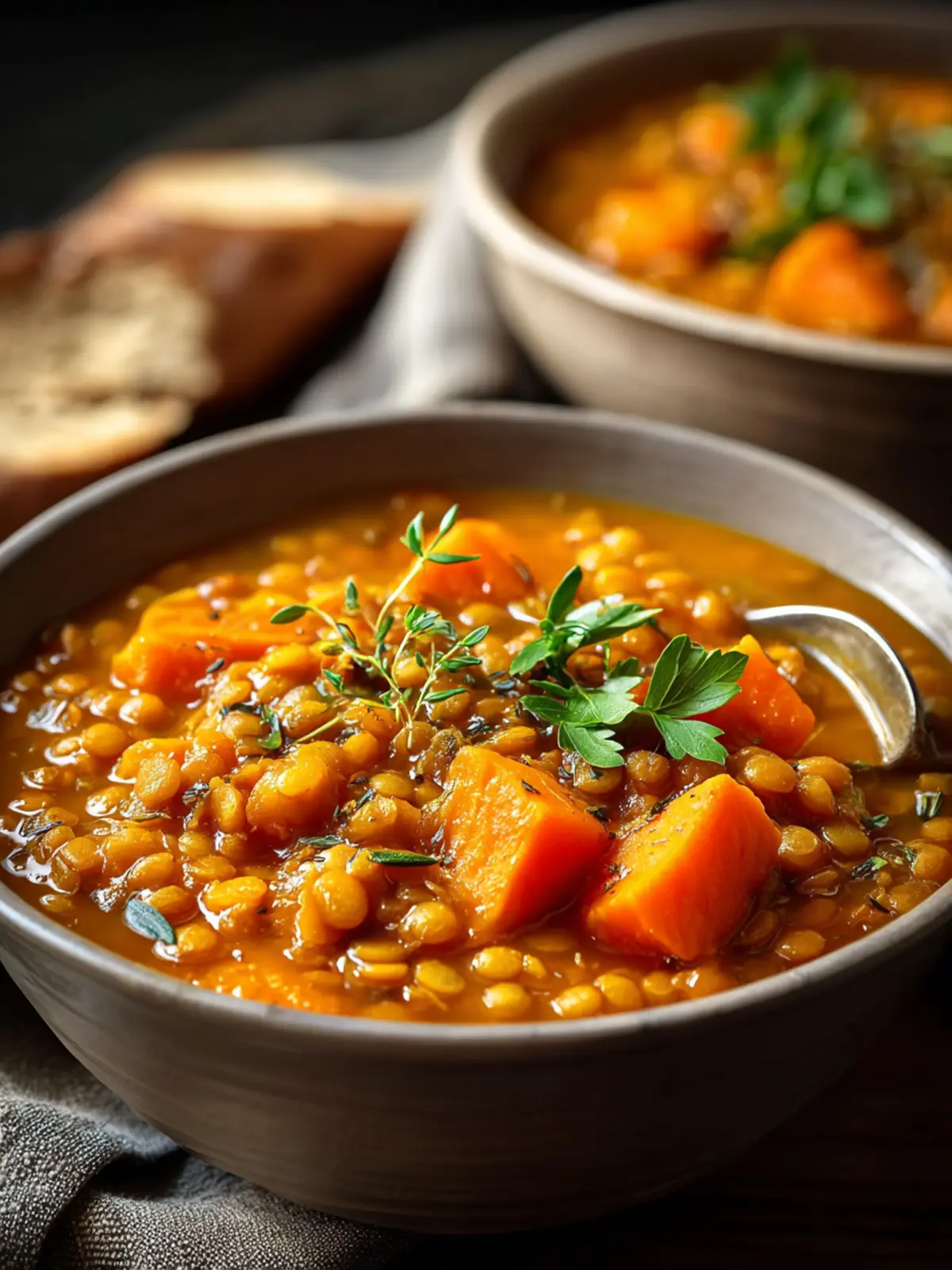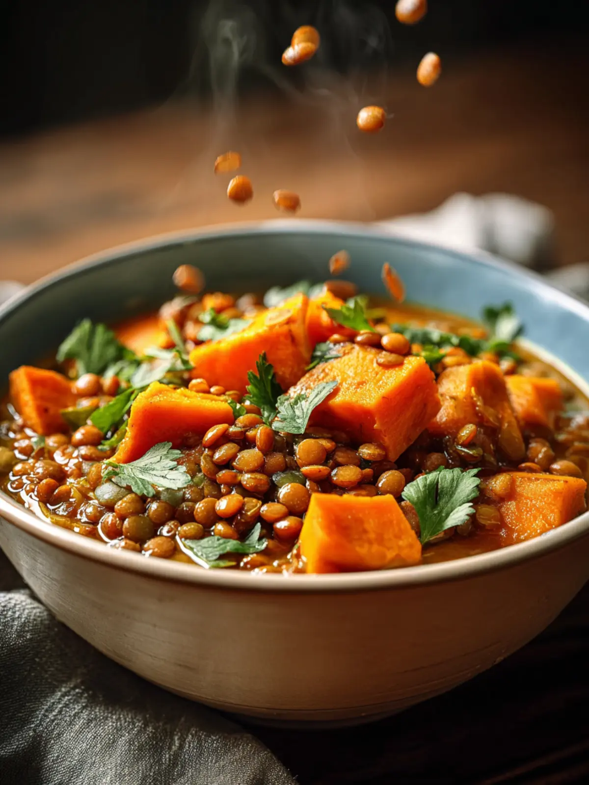 A hearty and nutritious soup made with green or brown lentils and sweet potatoes.