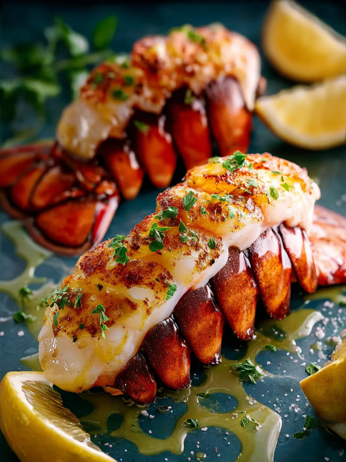 Delicious baked lobster tails with garlic butter and fresh parsley.