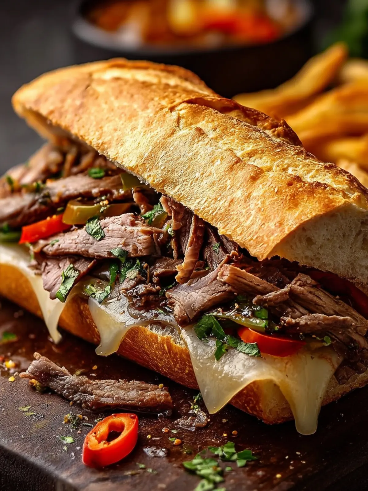 Peppers and Seasonings: Traditional sweet peppers or spicy giardiniera add a delightful crunch and zest, perfectly balancing the richness of the beef.