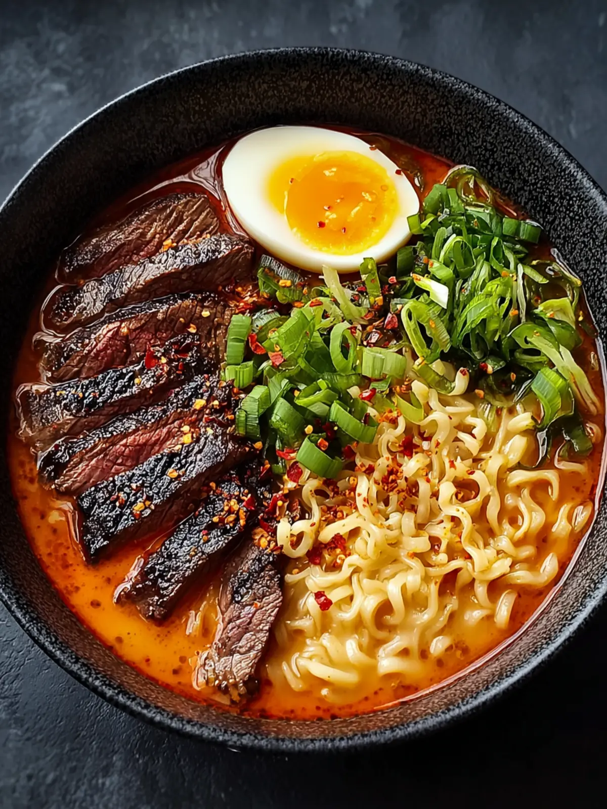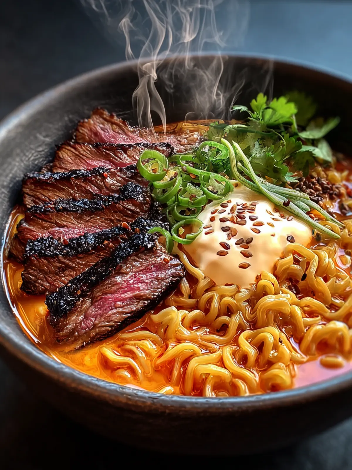 - Ladle ramen and broth into bowls. Top with grilled beef, a dollop of creamy sauce, and garnish with green onions, black sesame seeds, and optional chili oil.