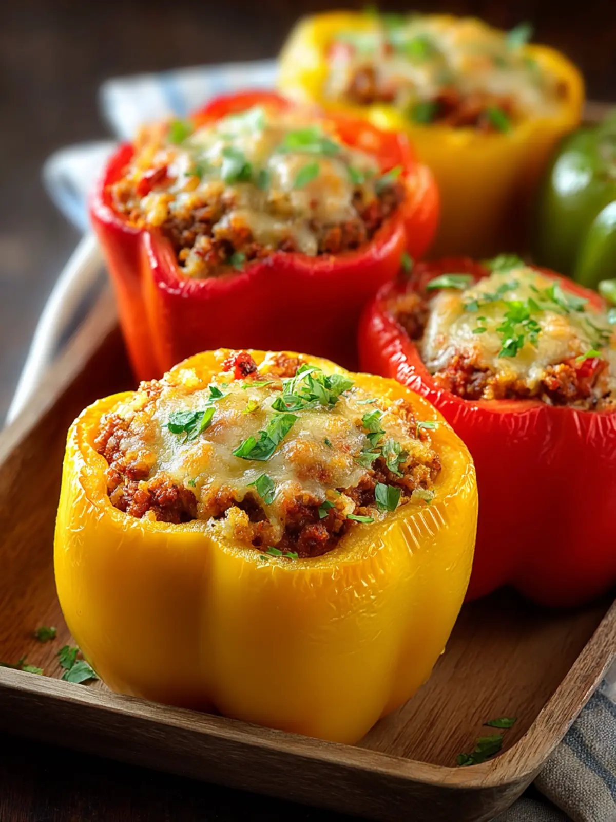 Deliciously stuffed bell peppers filled with a savory mixture of ground meat, rice, and cheese.